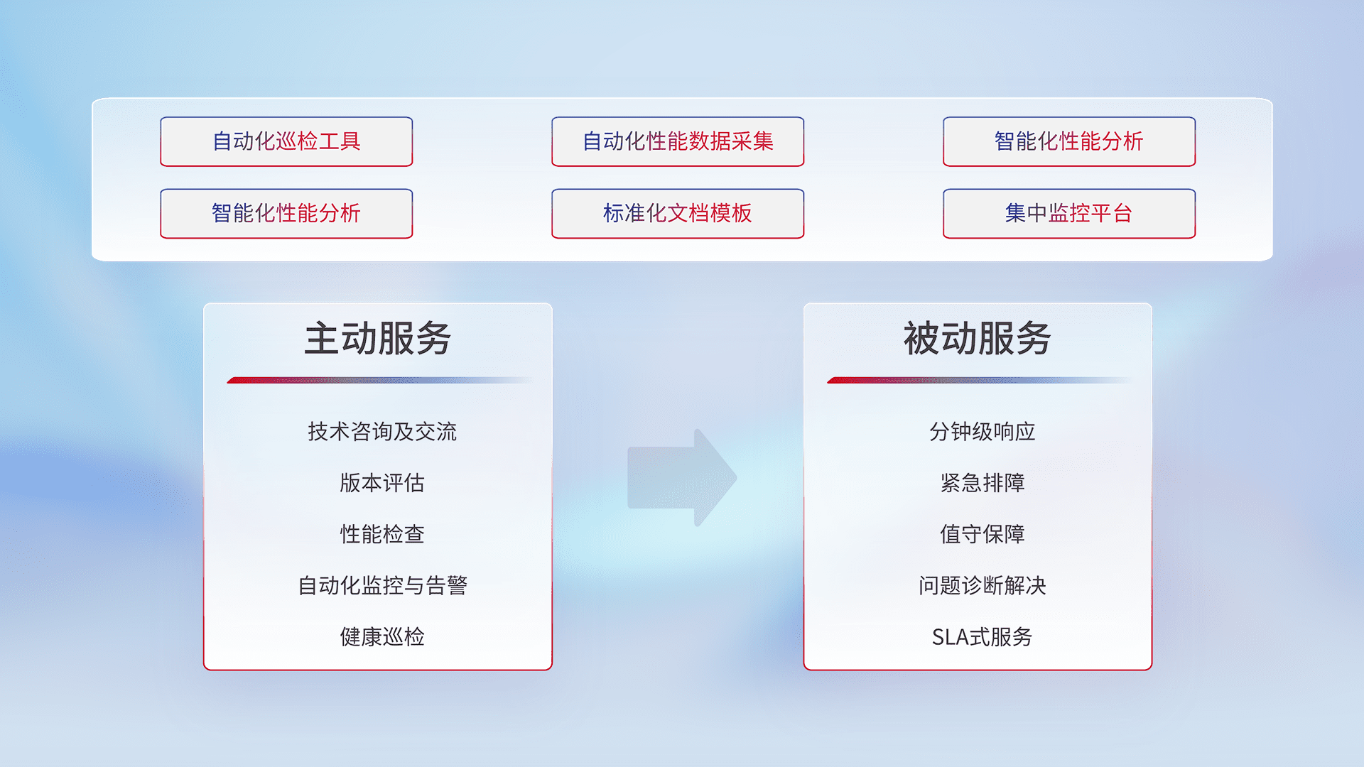 智能化工具和标准化文档,,,保障服务质量,,,,提供主动服务(包含技术咨询、、、、版本评估、、、、性能检查、、、、自动化监控与告警、、健康巡检)和被动服务包含(分钟级响应、、、、紧急排障、、、值守保障、、问题诊断解决、、、、SLA服务)。。。